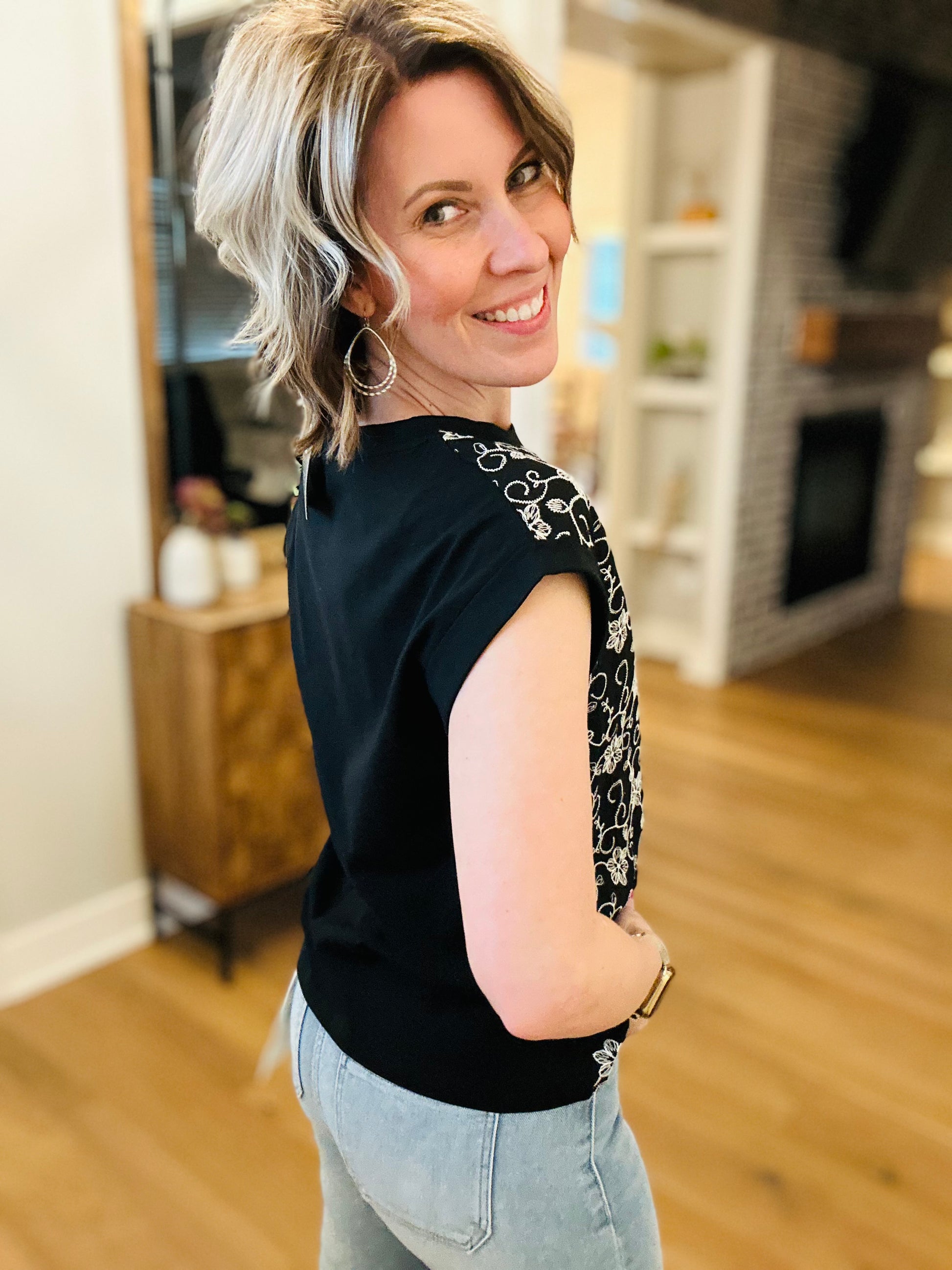 This one is special- it can be casual or dressy and not every top can do such a thing! The front has this adorable floral design STITCHED on- the back is solid black