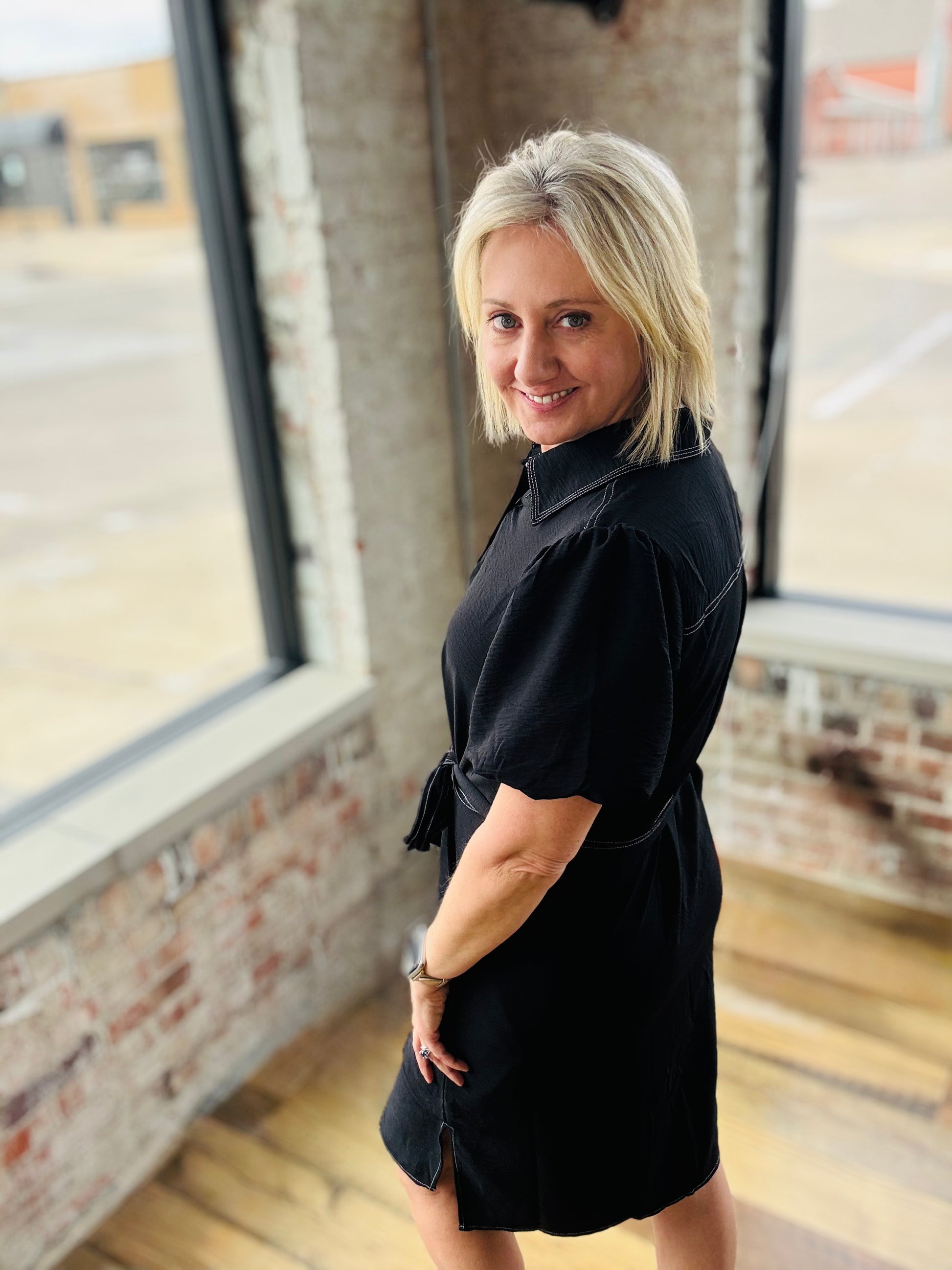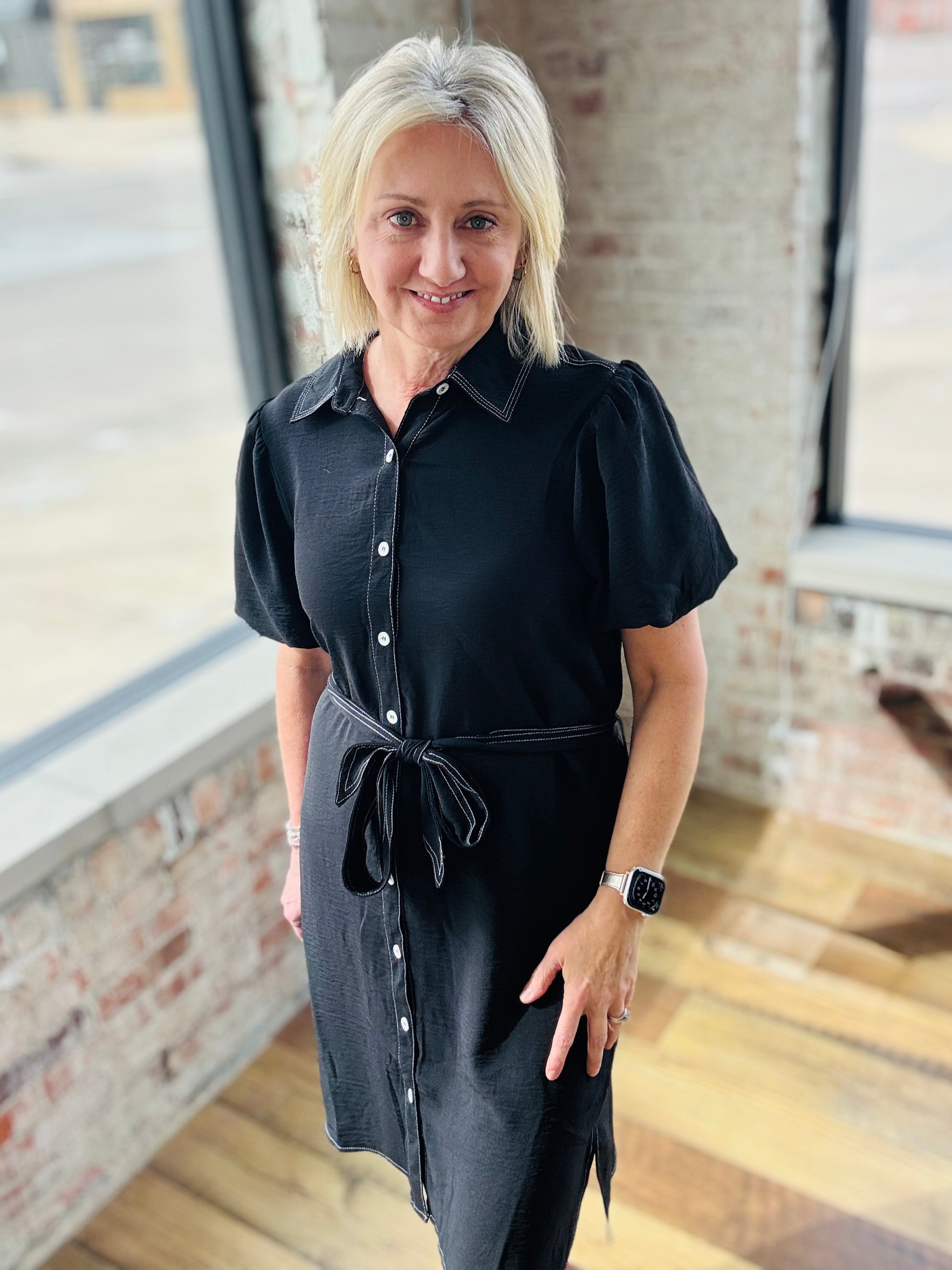 Designed with a lightweight, flowy feel, this dress features contrast stitching, puff sleeves for a feminine touch, and a tie waist to define your shape just right.