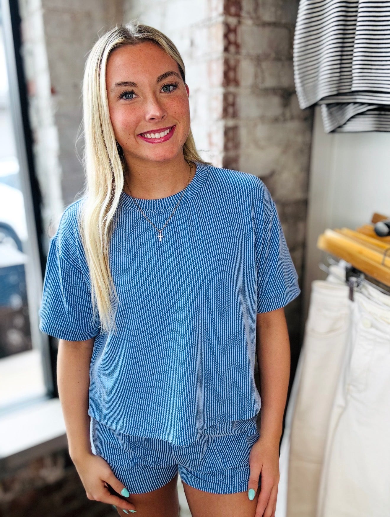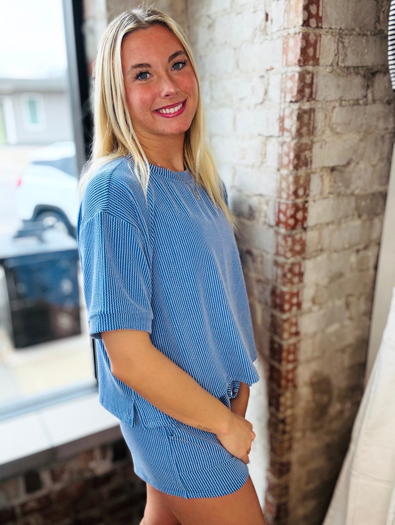 This cute textured two-piece set is made for comfort without sacrificing style! Featuring a soft ribbed fabric, relaxed short sleeve top, and matching pull-on shorts for an easy fit. Lightweight, breathable, and perfect for everyday wear, this set is great for lounging, casual days out, or travel days when you still want to look put together.