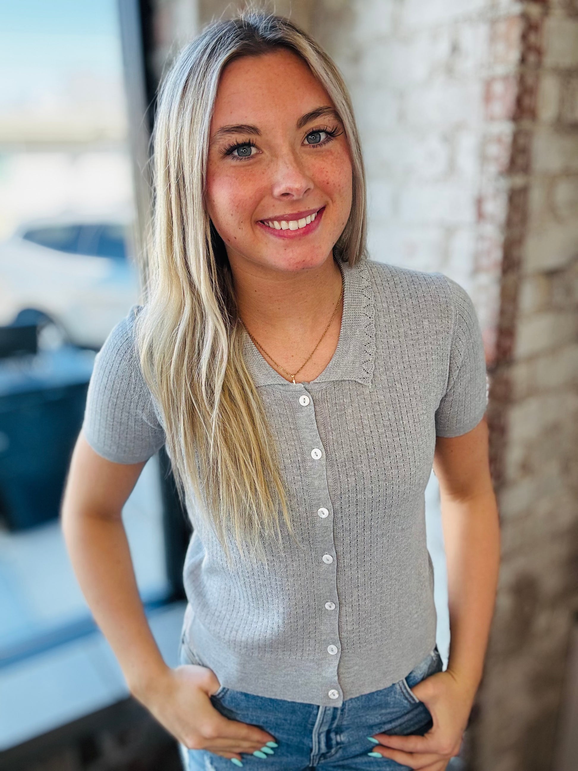 Featuring a soft ribbed knit texture, classic button-down front, and a flattering fitted silhouette, this top is an effortless piece you’ll reach for again and again. The delicate scalloped collar adds the sweetest feminine touch, making it easy to dress up or keep casual.