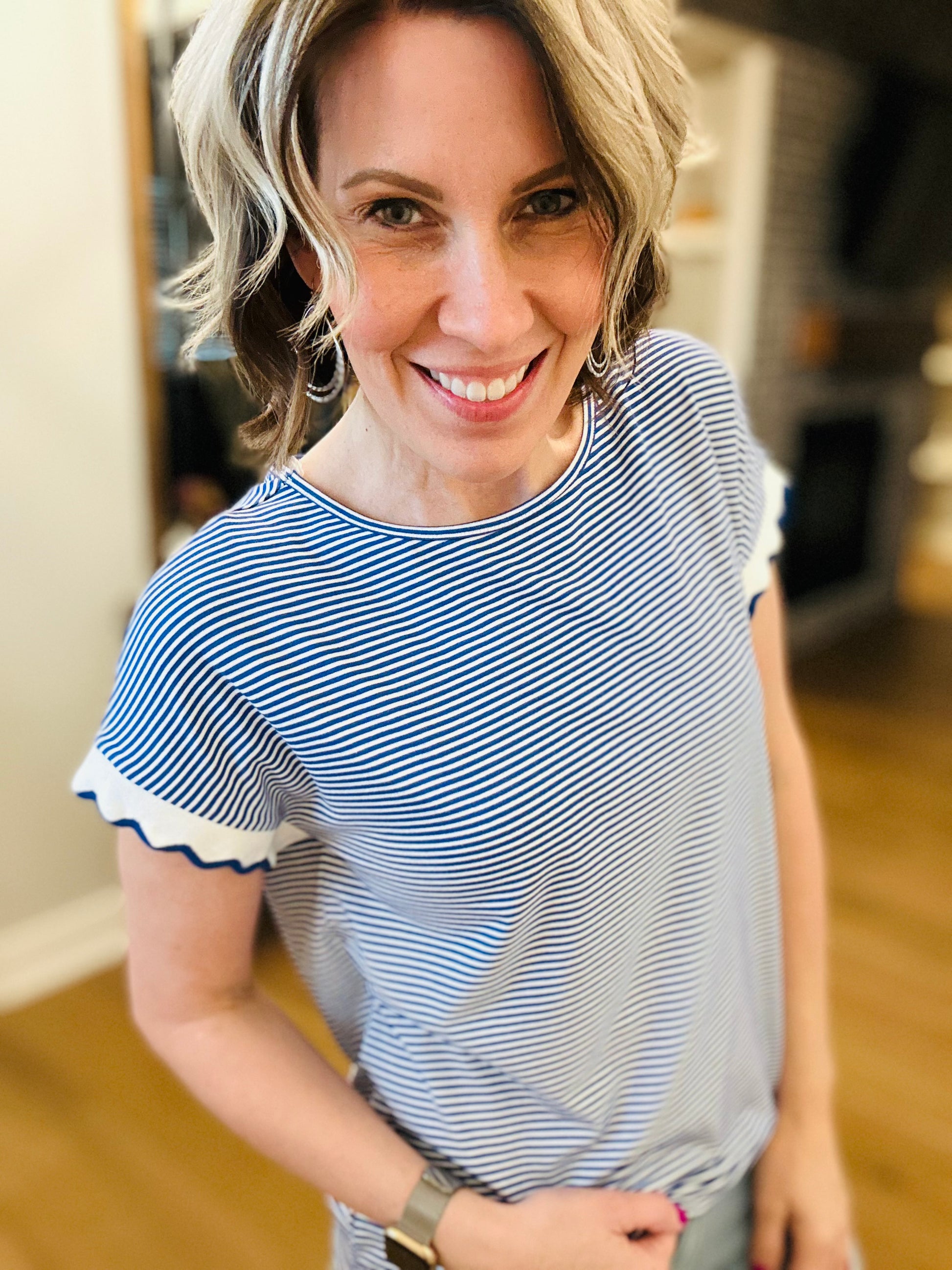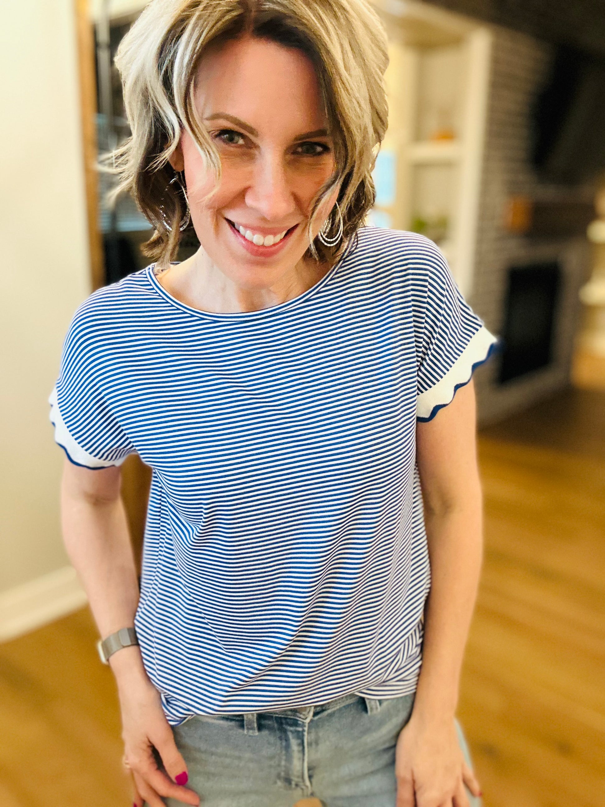 Oh heavens is this one so cute! Royal blue- a color that everyone looks so good in and this adorable sleeve is just as cute as can be! Perfect for jeans or capris-