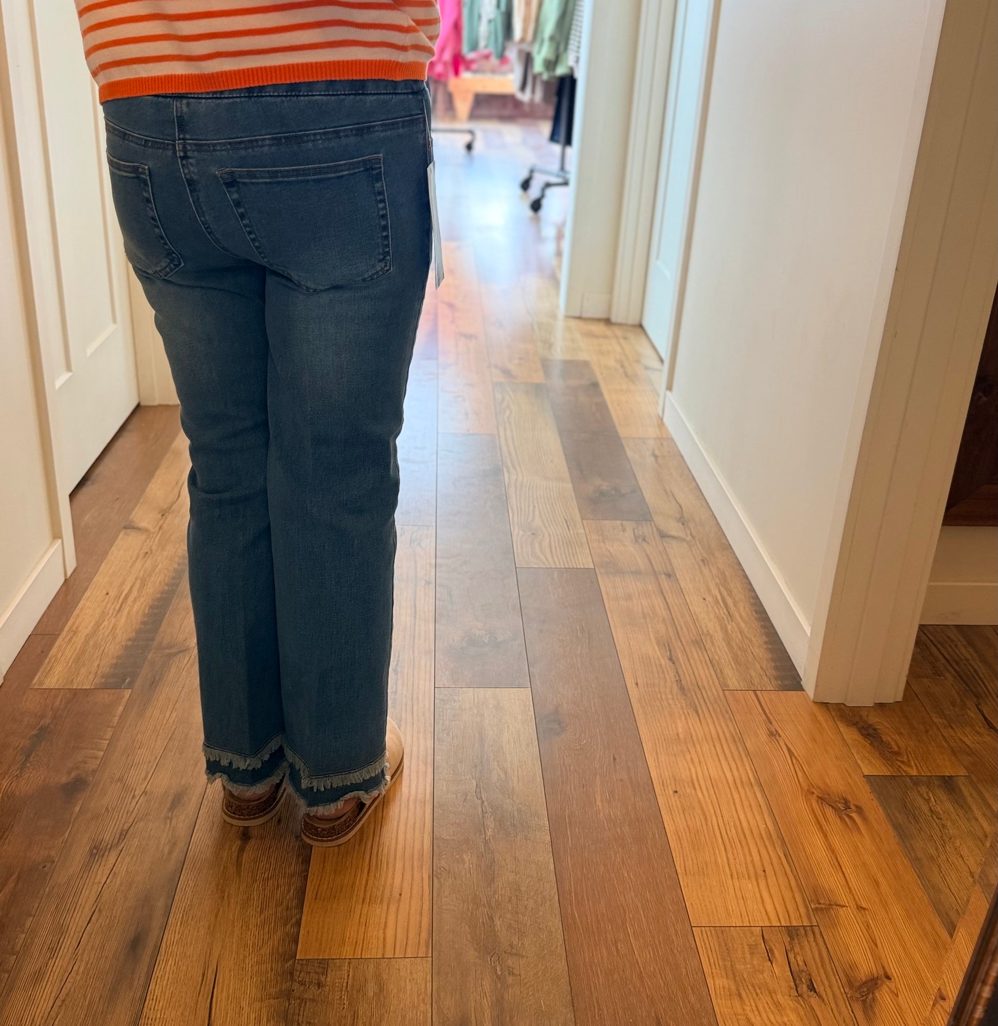 Slim-Sation medium wash pull-on denim with double fray hemline.