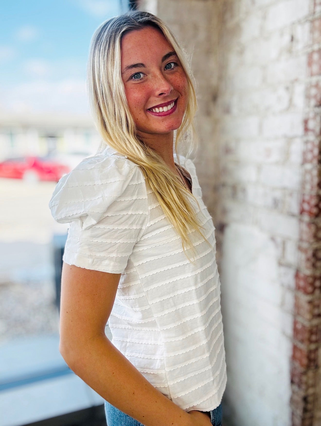 This adorable white textured top is the perfect mix of classic and feminine. Featuring a flattering v-neckline, subtle puff sleeves, and beautiful textured stripe detail, it’s an easy piece to dress up or down. Pair it with your favorite denim for a polished everyday look!
